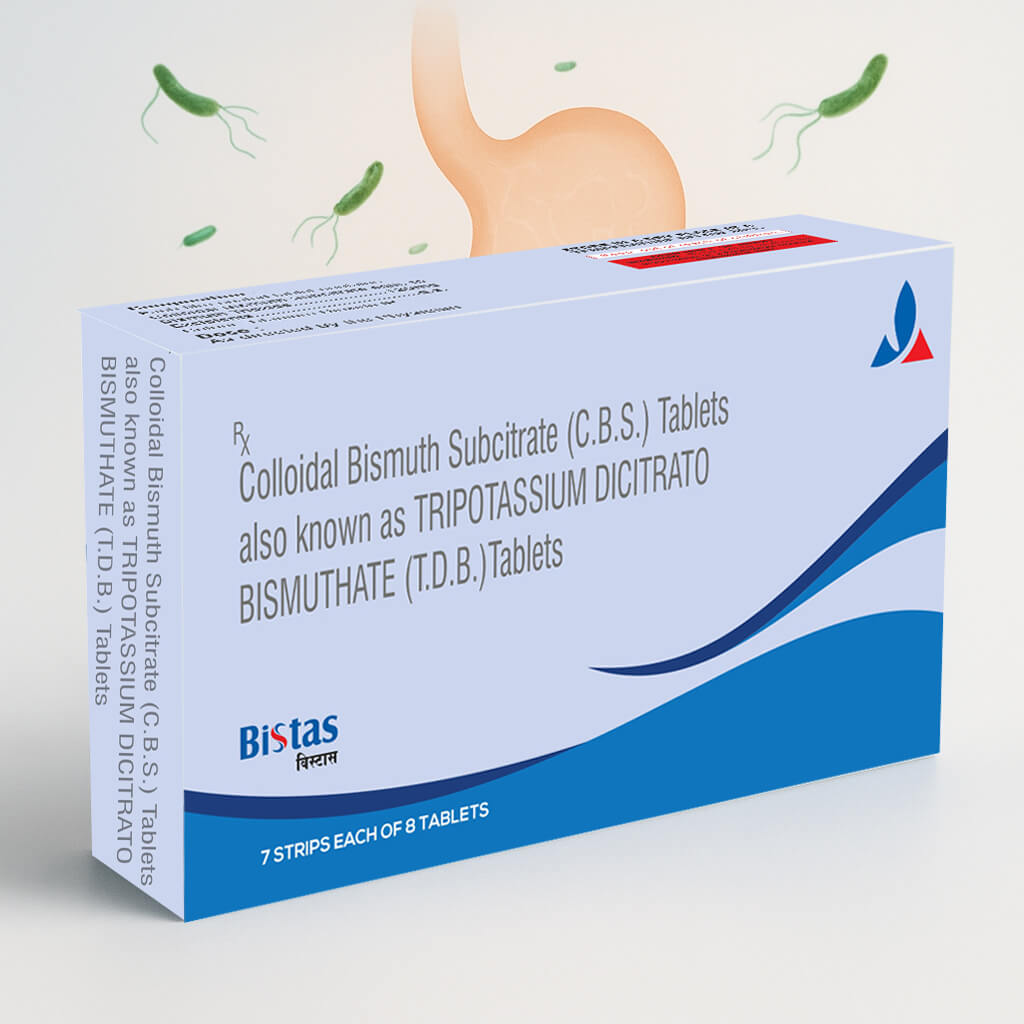 BISTAS (Colloidal Bismuth Subcitrate Tablets) is a bismuth-based anti-ulcer drug used in combination with antibiotics and a proton pump inhibitor to eradicate H. pylori infection of the human gastric mucosa.